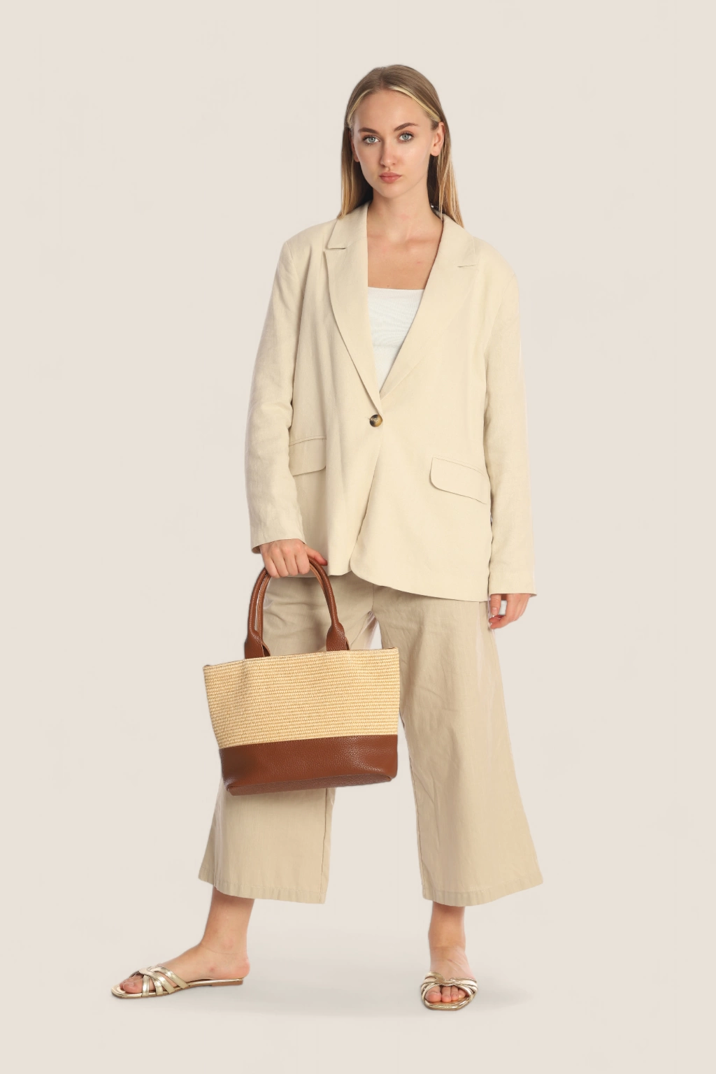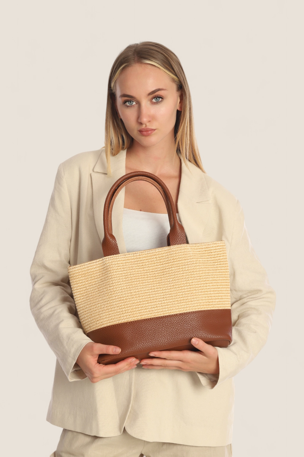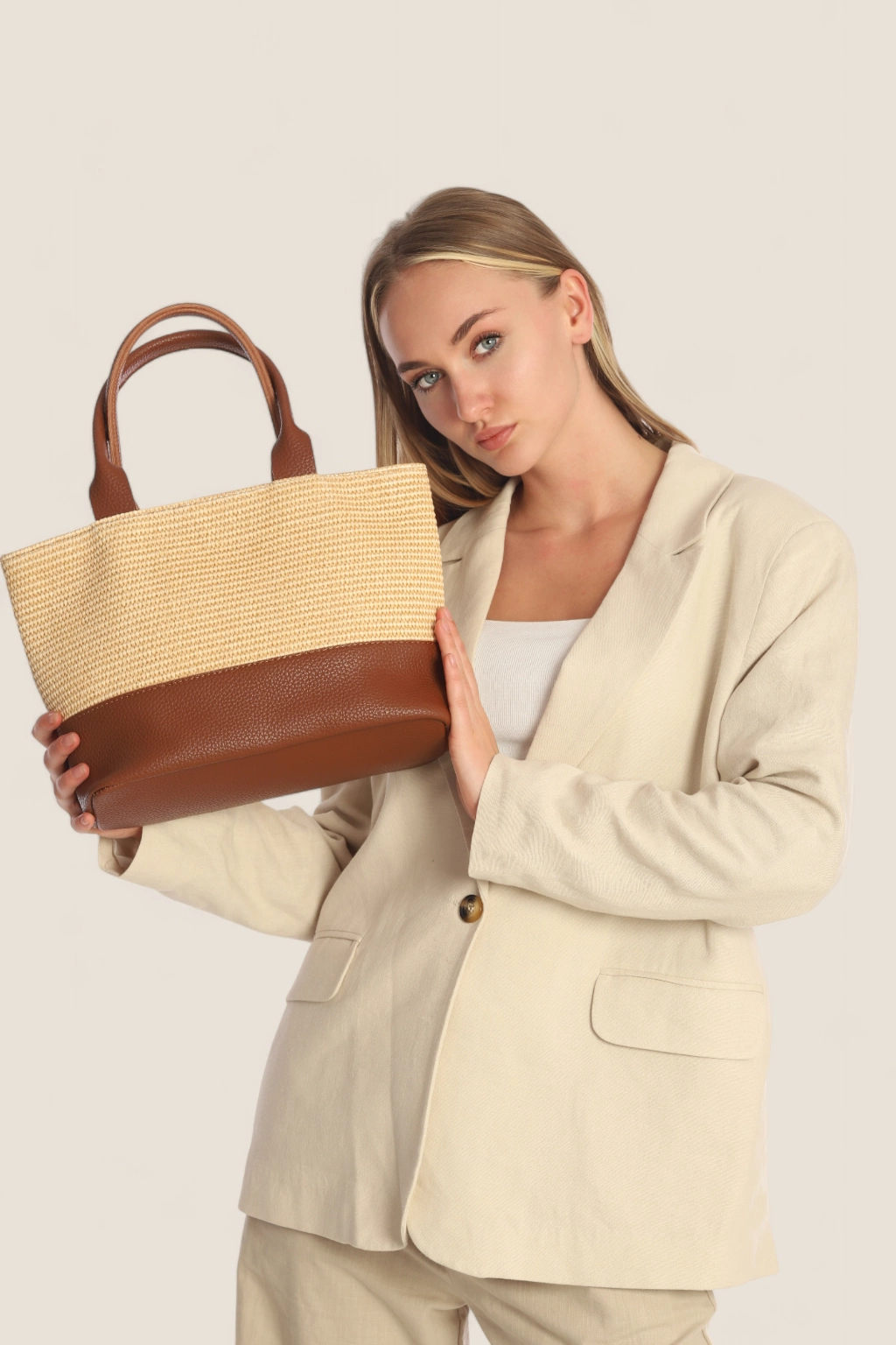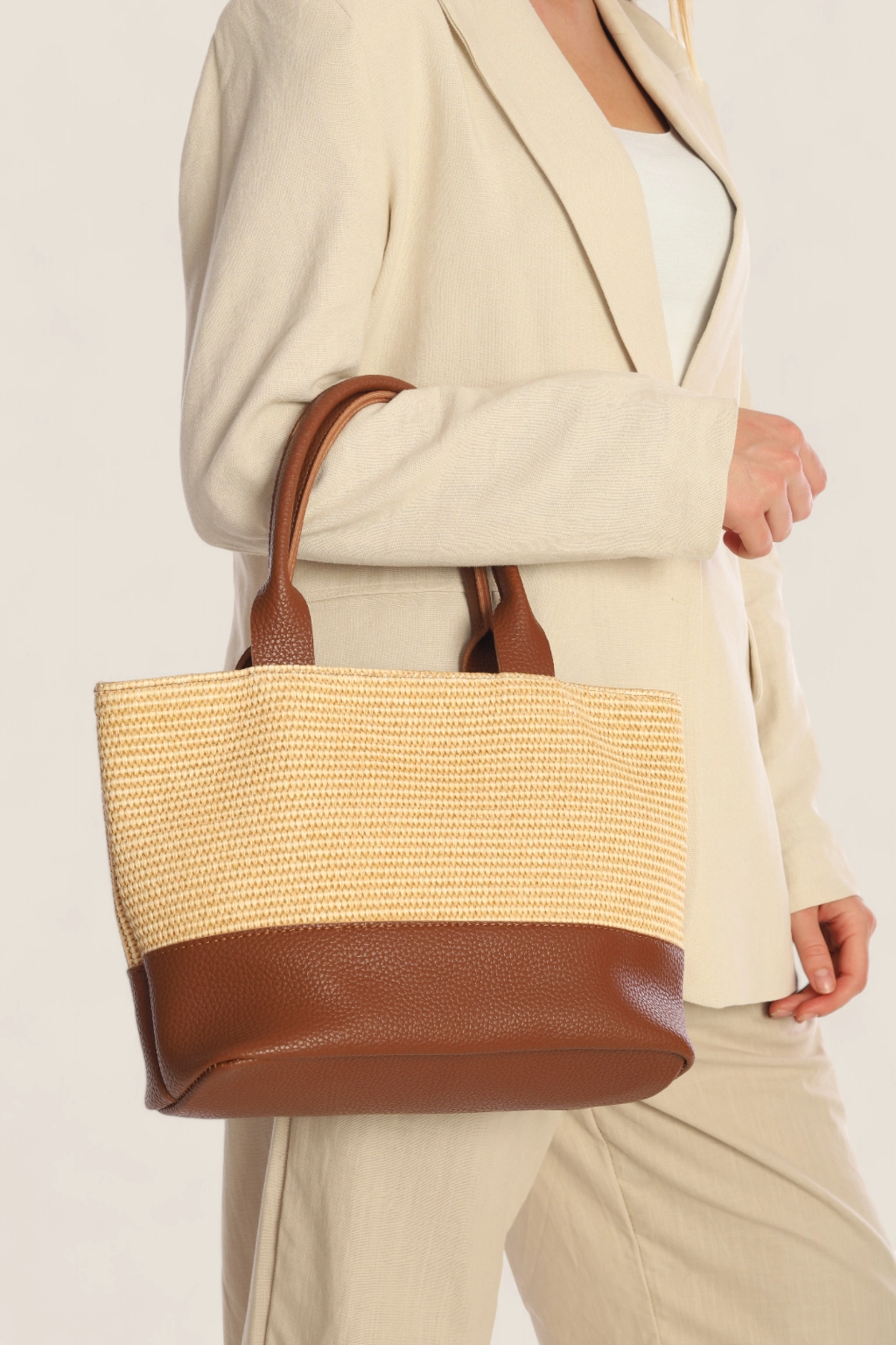 KULLANILABİLİRLİK: GENİŞ İÇ HACİMLİ, DERİ VE HASIR DETAYLI ÇANTA